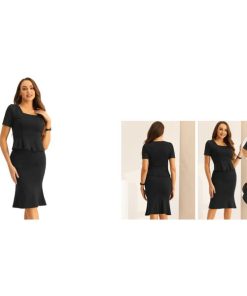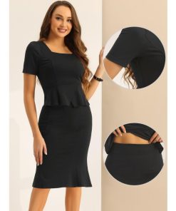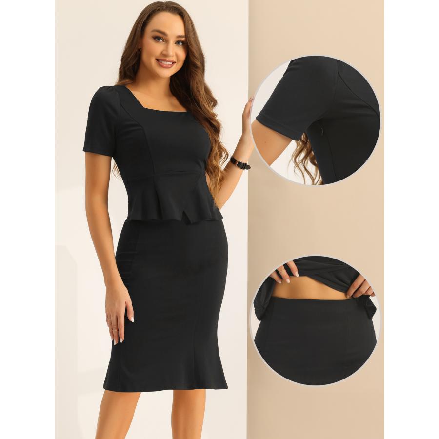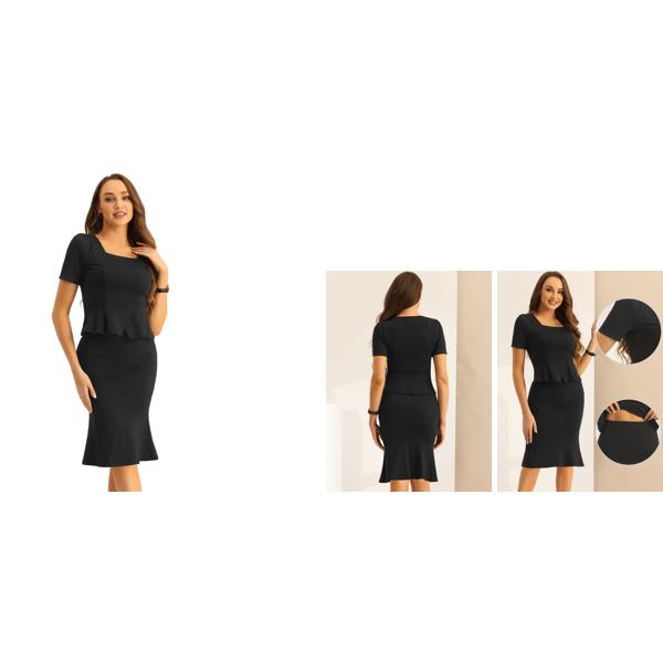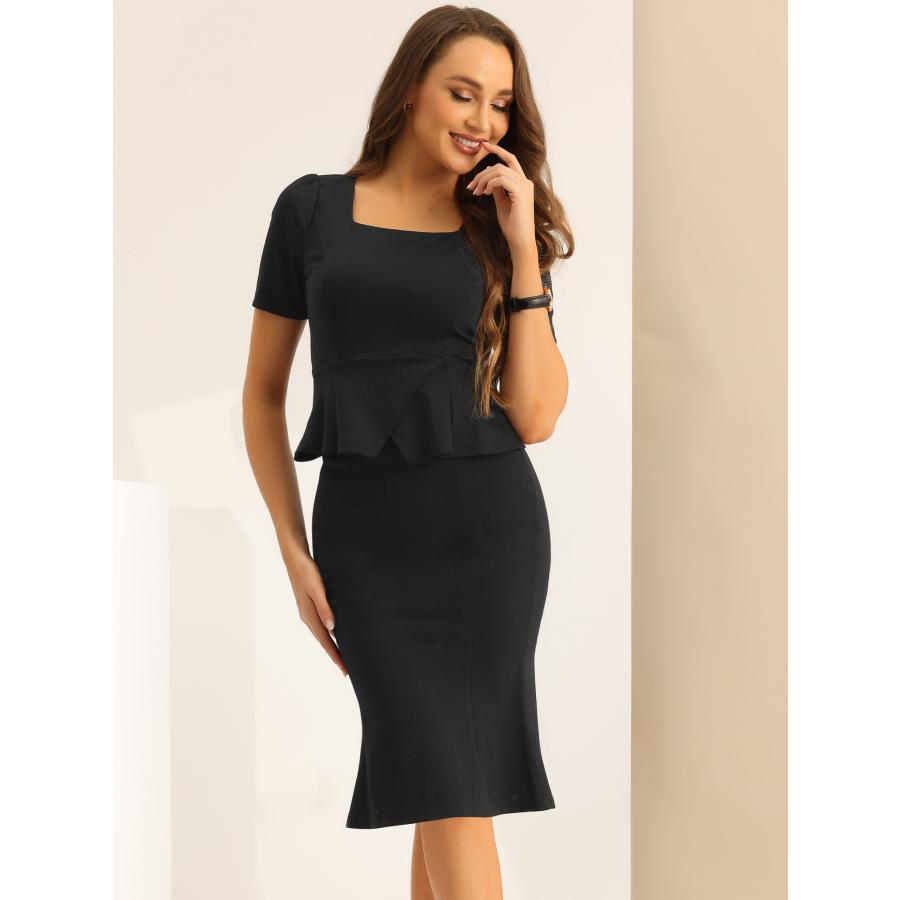 Allegra K ペプラムブラウス スカート スクエアネック 半袖トップ フィッシュテール スカートスーツ 2点セット レディース ブラック S