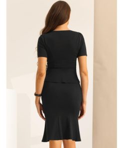 このスーツ セットはいくつかのデザイン ディテールで構成されています:半袖ブラウス トップ、フリル ペプラム、膝丈ボディコン スカート